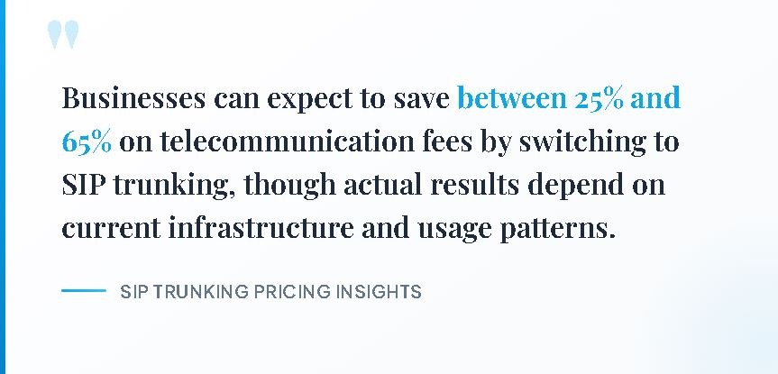 Cost reduction percentages vary based on current spending levels and calling patterns. Businesses can expect to save between 25% and 65% on telecommunication fees by switching to SIP trunking, though actual results depend on current infrastructure and usage patterns.