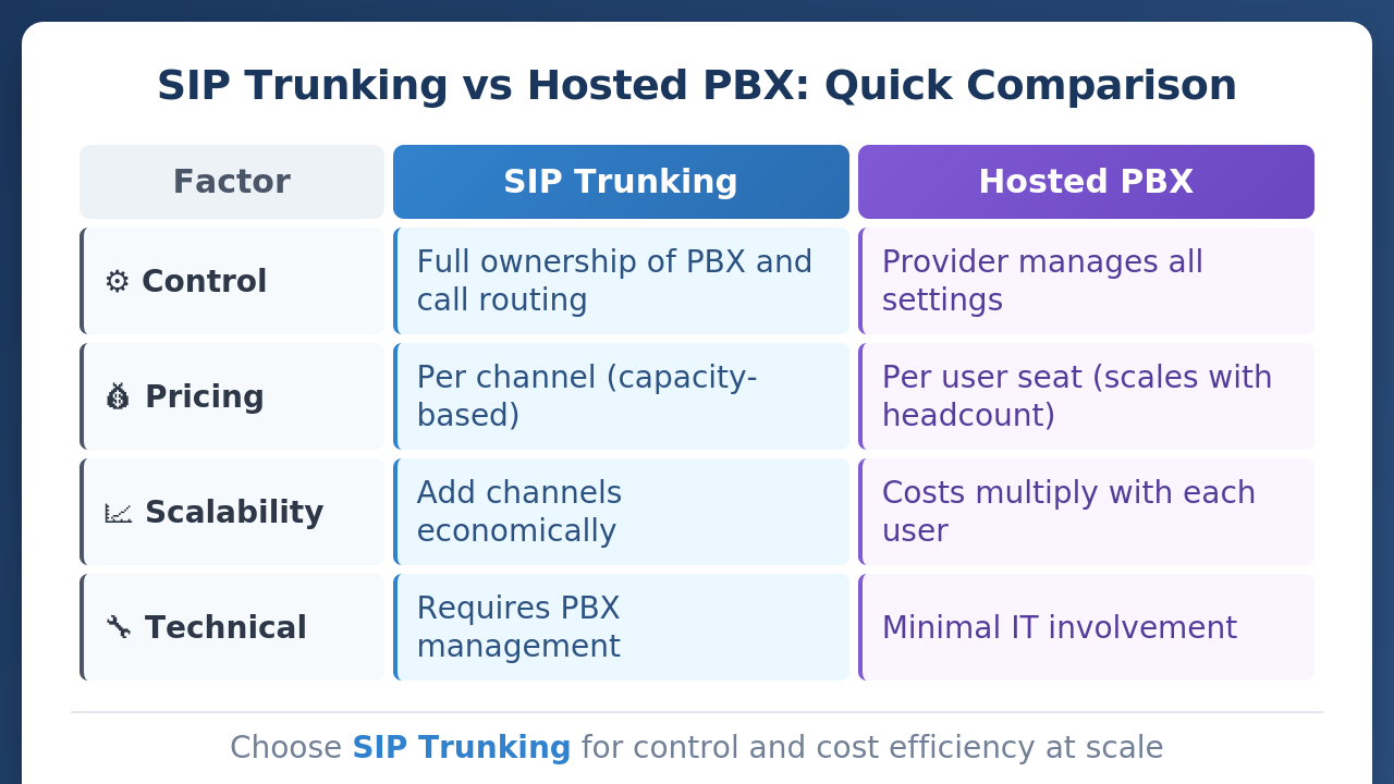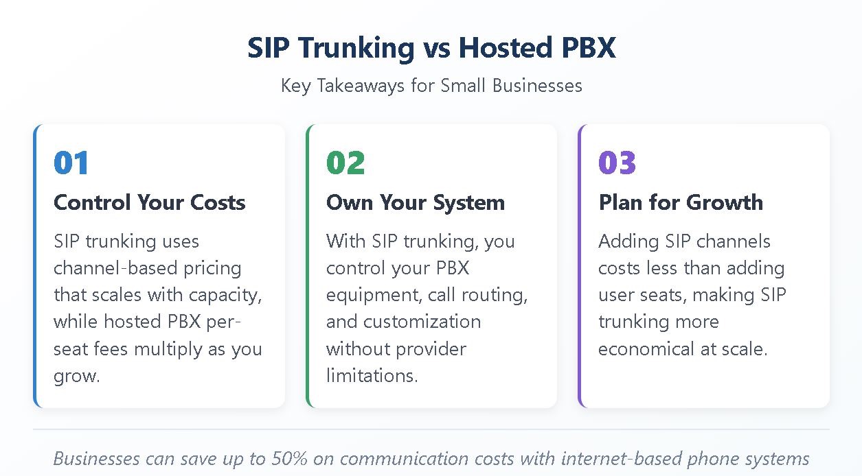 The SIP trunking vs hosted PBX decision comes down to how much control you want over your business communications. Hosted PBX trades flexibility for convenience, while SIP trunking rewards businesses willing to manage their own systems with lower costs and greater customization.