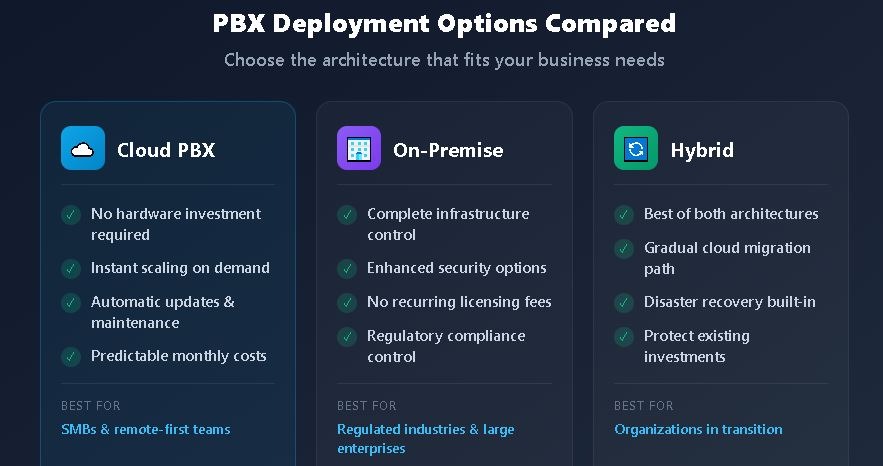 Understanding the fundamental differences between PBX architectures helps organizations match solutions to their specific circumstances and strategic priorities.