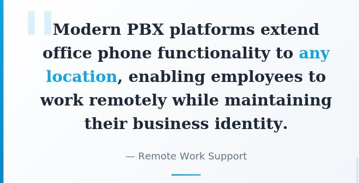 Remote Work Support. Modern PBX platforms extend office phone functionality to mobile applications, softphones, and home office setups. Employees working remotely maintain their business phone numbers, access company directories, and participate in call queues as though physically present. For organizations evaluating SIP trunking for small businesses, this flexibility proves essential for supporting distributed workforces.