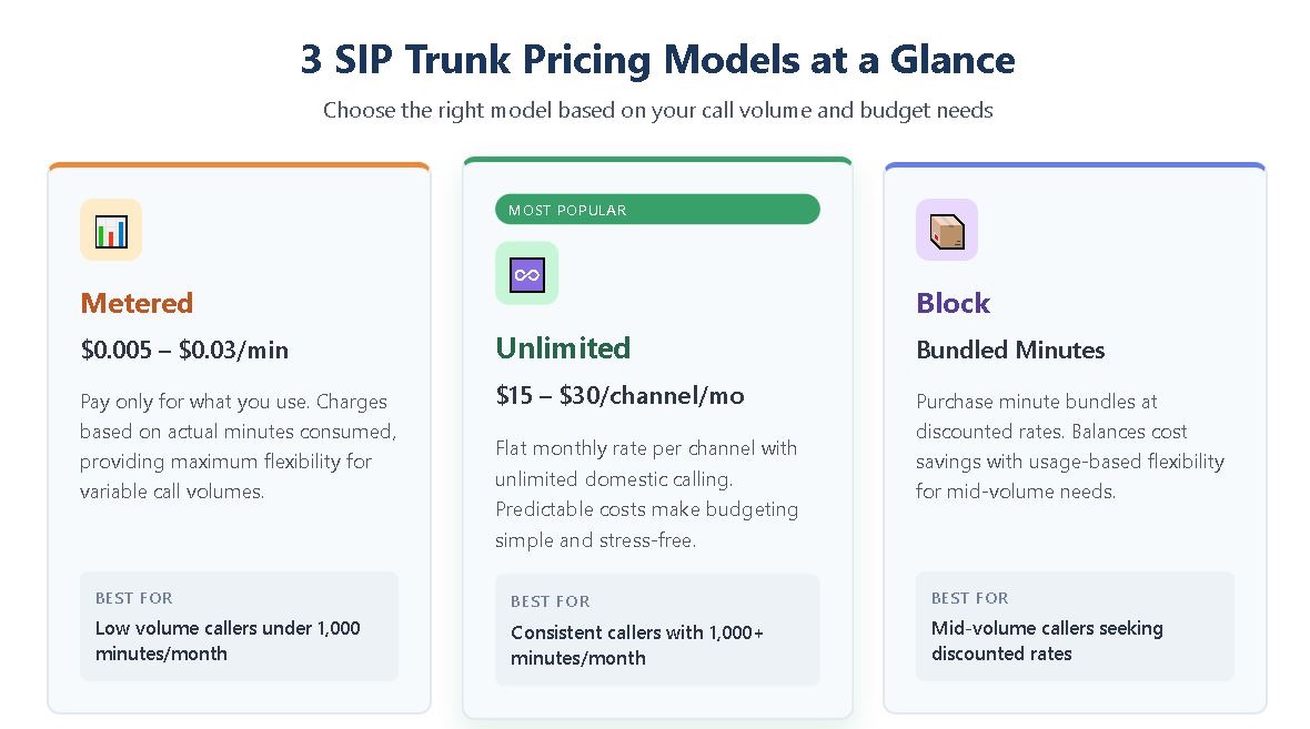 Understanding SIP trunk pricing empowers you to make informed decisions about your business communication. The right pricing model depends on your call volume patterns, growth trajectory, and preference for predictability versus usage-based billing. Most small and mid-size businesses find that unlimited plans deliver the best combination of value and simplicity.
