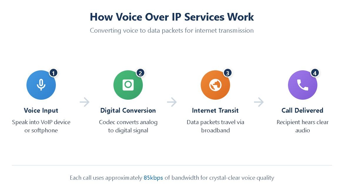 - VoIP-compatible devices, including IP phones, softphones on computers or mobile devices, or traditional phones with VoIP adapters, capture and transmit calls.