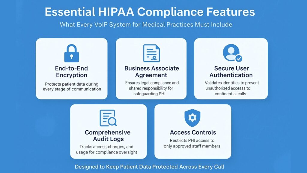 HIPAA-compliant phone systems include end-to-end encryption, secure user authentication, comprehensive audit logs, and Business Associate Agreements with providers. These features protect Protected Health Information during transmission and storage, meeting regulatory requirements for healthcare communications.