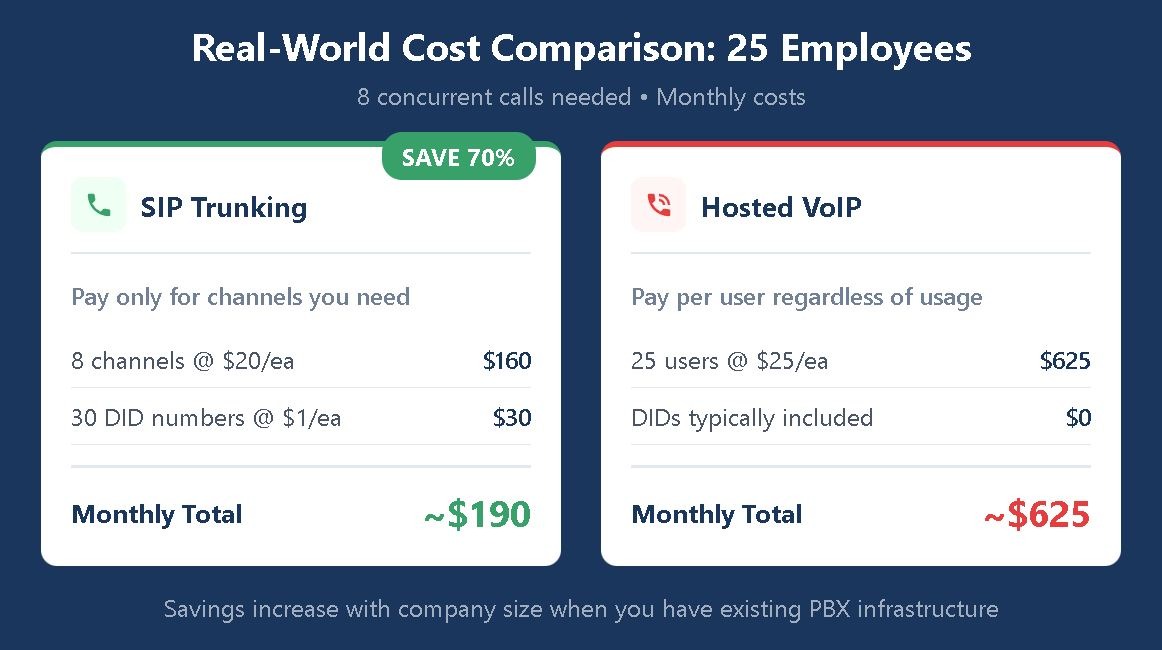 This example illustrates why businesses with existing PBX systems often find SIP trunking more economical. The cost advantage grows with company size and decreases if you need to purchase PBX equipment.